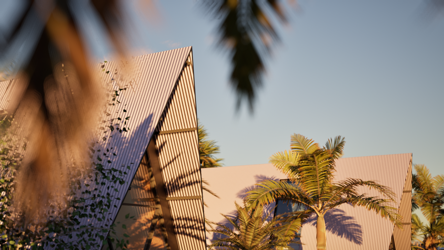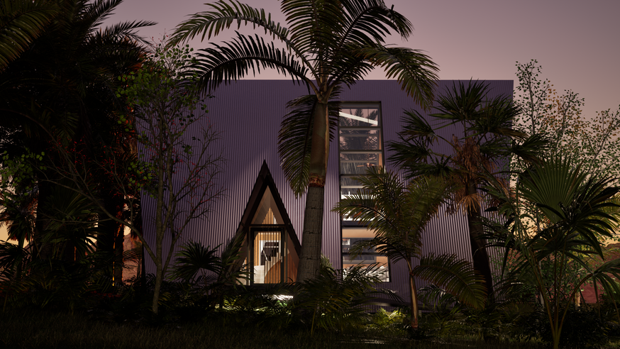 The architecture of The “A com” unfolds as two A-frame cabins, gracefully tapering towards the forest canopy and flowing down toward the river that winds through the site. This design not only offers sweeping views of the forest but also minimizes its impact on the delicate hummingbird habitat within the emergent layer of the forest. By lifting the structure and allowing it to blend seamlessly with its surroundings, the design ensures that the cottage exists in a respectful dialogue with the natural world.